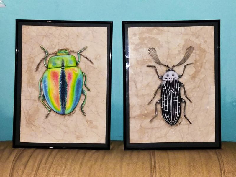 Papír jsme si přípravili tak, že jsme ho napřed pokrčili, pak jsme papír polili čajem, počkali až čaj vsákne do papíru (hlavně do záhybů), znovu narovnali a nechali uschnout. Textura papíru je nádherná. Jemná tykadlla jsme dokreslili. Hotoví brouci i s podkladem šup do rámečku …a dárek je na světě.