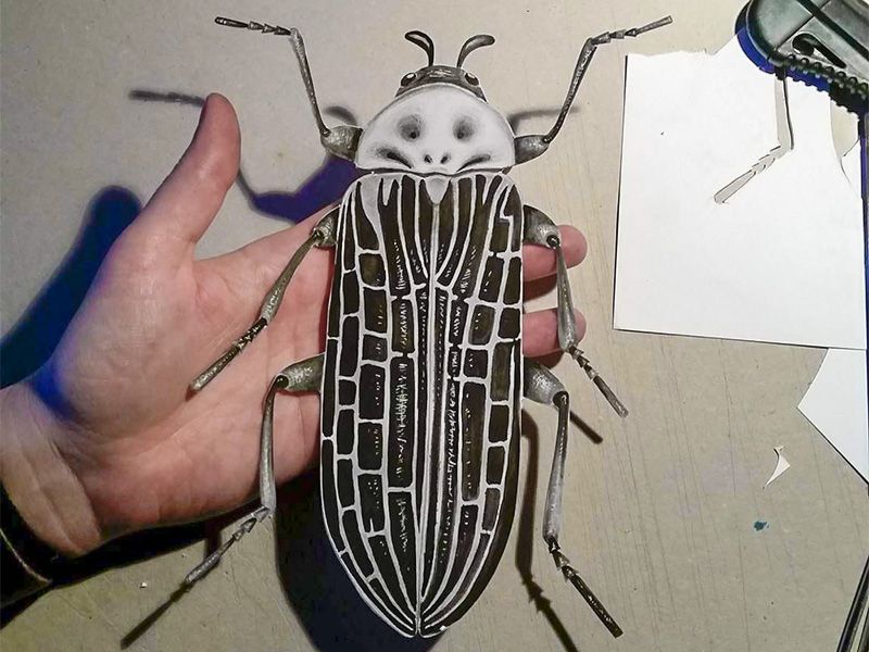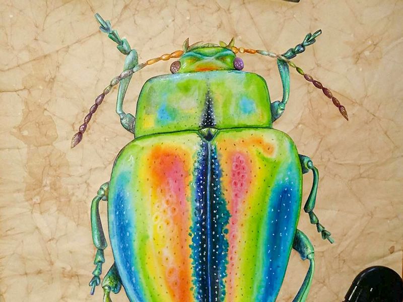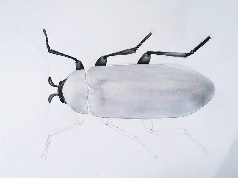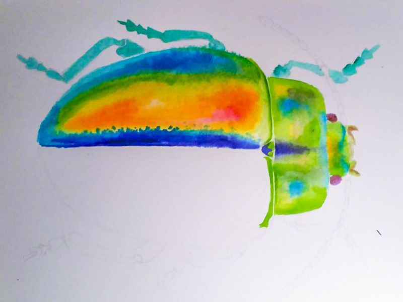 Napřed skica tužkou a pak vodové barvy. Brouci napřed dostali hrubé kontury, pak jsme je dokreslili do detailu. Pak vše precizně vystřihnout/vyřezat (speciální disciplína byly nožičky, chce to opravdu nervy ze železa) a nalepit na na papír.