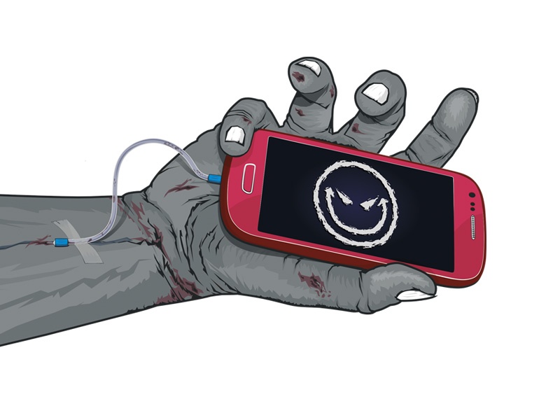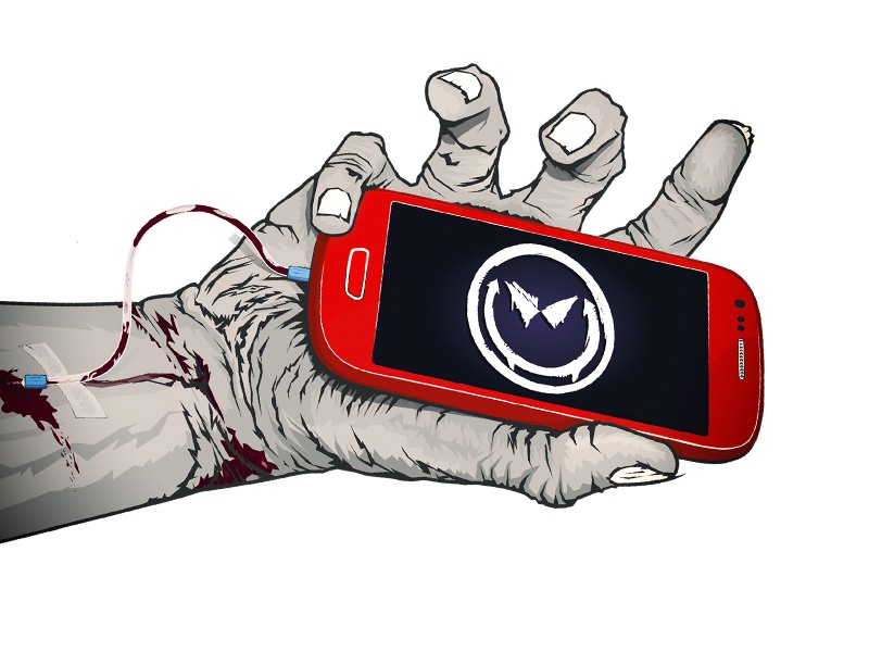 Kapele se ruka zdála málo vysušená, museli jsme ji tedy udělat mnohem více „zombie“. Přidali jsme i víc krve protékající kapačkou a více kontrastu. Telefon dostal zářivější, krvavou červenou barvu a smajlík agresivnější výraz a upíří zuby. Ústřední motiv je hotov, teď už jen zbývá zakomponovat ho do zbytku grafiky.