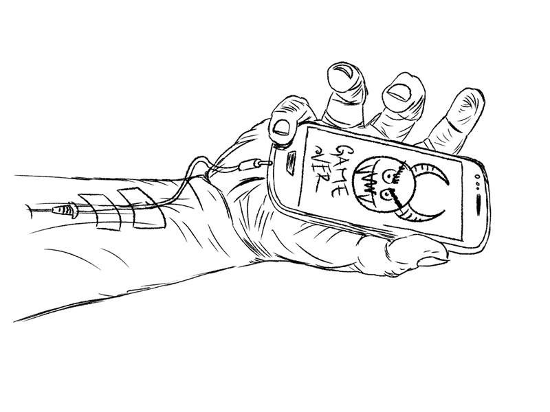 Rozhodovali jsme se mezi kompletní kresbou, vektorovou grafikou a fotkou. Po několika pokusech bylo jasné, že vektorová grafika bude v tomhle případě nejlepší. Celá deska měla být laděná do studených, počítačových barev. Převládá šedá, modrá a černá. Pouze mobil musí být v kontrastu. V ruce už není ani kapka krve, ta poslední, kterou mobil vysál nakrmí tak akorát ironického smajlíka.